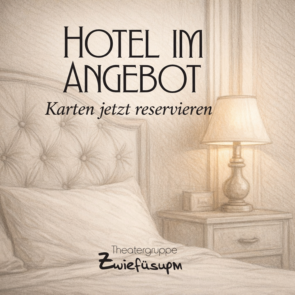 - HOTEL IM ANGEBOT – wir spielen 2026!Die Theatergruppe Zwiefüsupm bringt 2026 die rasante Verwechslungskomödie „Hotel im Angebot“ von Michael Parker auf die Bühne. Worum geht’s?Das marode Turtle Beach Hotel auf den Florida Keys soll verkauft werden. Um den Schein zu wahren, verwandelt Manager Brian Cody das verbliebene Personal kurzerhand in „Gäste“. Als dann auch noch ein mysteriöser Käufer auftaucht, der einem…